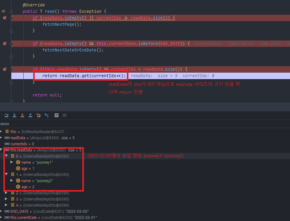 - 2번의결과가 빈리스트이면 null을 리턴하여 해당 Step의 종료를 알리고 조회결과 데이터가 존재하면 응답 받은 해당 readData에서 currentIdx를 통해 객체를 하나를 리턴하고 이것을 반복합니다.
