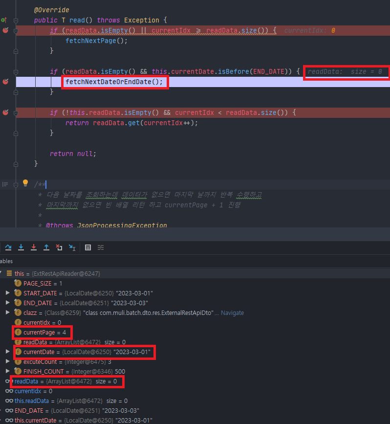 currentDate = 2023-03-01 , currentPage = 4, readData = 0 임으로 해당 날짜는 더이상 데이터 없다 판단하여 2번 if을 타고 다음 날짜를 조회하게 됩니다.