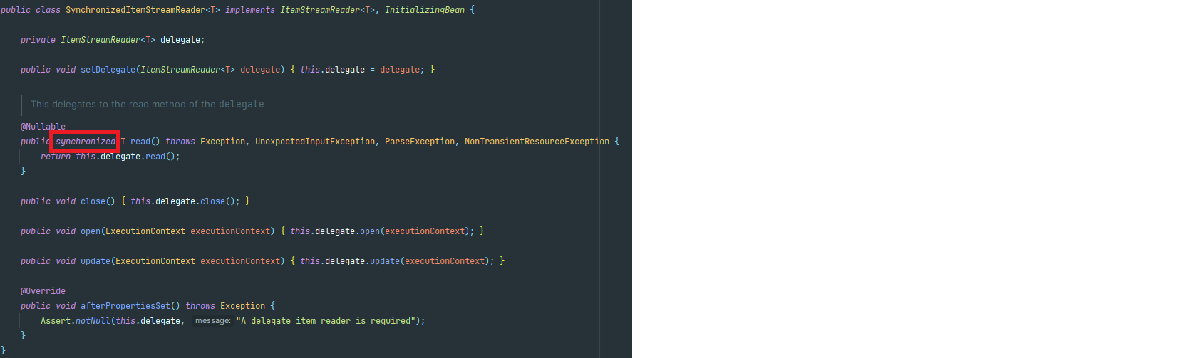 아래와 같이 SynchronizedItemStreamReader에 위임을 하는 코드로 변경 해서 동작 시키면 정상 동작을 확인 해 볼 수 있습니다.