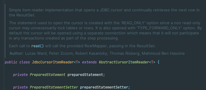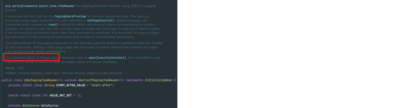 이유는 간단합니다. JdbcCursorItemReader는 Thread-safe 하지 않다는 것입니다. 그렇기 때문에 멀티쓰레드 방식에서는 위와 같은 에러가 발생 할 수가 있습니다. 아래는 JdbcPagingItemReader 와 JdbcCursorItemReader 인데요 빨삭색 박스를 보시면 JdbcPagingItemReader는 Thread-safe 하다고 명시를 해놓은 반면에 JdbcCursorItemReader는 관련 내용이 없습니다.