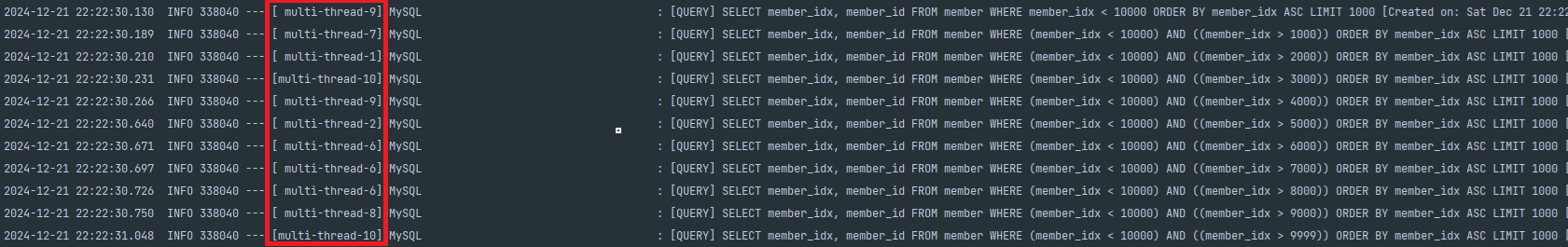약 2초 걸리는 것을 확인 할 수가 있습니다. 데이터가 1만건 정도 이기 때문에 thread가 많아도 처리할 대상이 적으면 유의미한 효과는 보기 힘들 수 있지만 저희는 멀티 쓰레드로 열심히 동작 하고 빠르게 처리가 가능하겠구나 정도로만 알 수 있으면 될 것 같습니다.