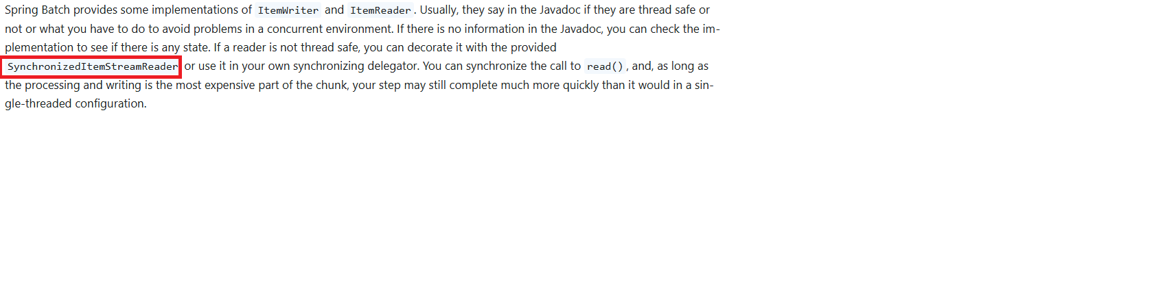 그러면 Cursor를 사용 할 수 없는 걸까요? 다행히도 아래와 같이 Spring docs 에서 Reader가 Thread-safe 하지 않다면 SynchronizedItemStreamReader을 사용 하면 된다고 설명해주었습니다.