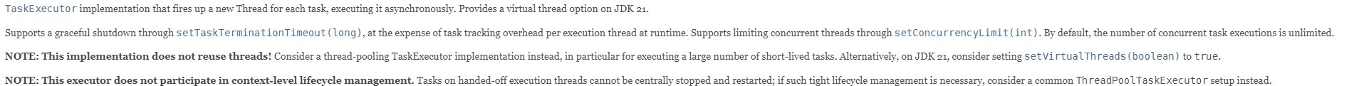 위에 Spring docs의 테스트 코드에서는 SimpleAsyncTashExcutor 를 사용했는데 아래와 같이 SimpleAsyncTashExcutor 는 ThreadPool을 이용하여 Thread를 재사용 하는 방식이 아닌 새로 생성해서 사용하는 방식임으로 TaskExcutor를 구현해서 사용하라고 되어 있습니다.