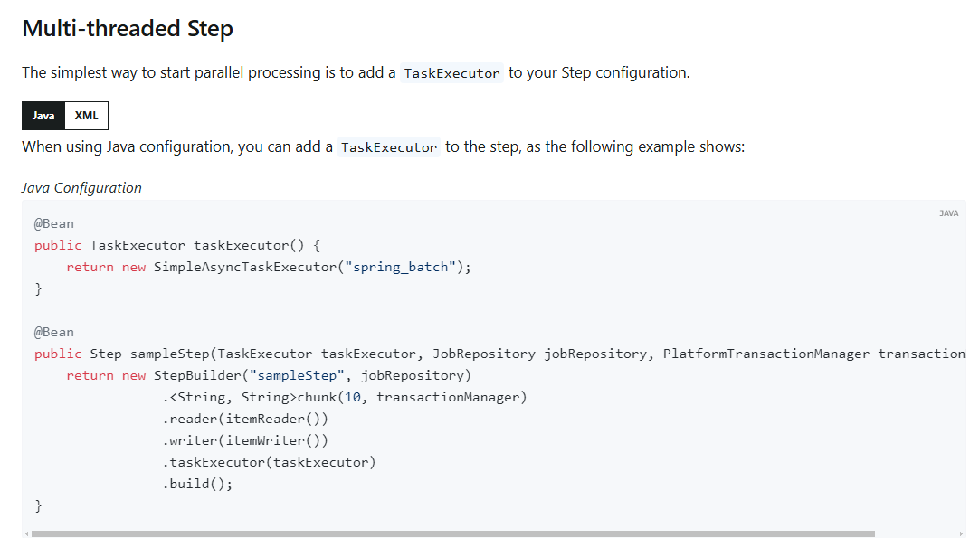 즉 Multi-threaded Step은 단일 Step에서 여러 쓰레드를 병렬로 실행하여 작업을 처리하는 방식입니다. 자세한 설명은 아래의 Spring docs에 자세히 설명 되어 있으니 참고해 보는 것도 좋을 것 같습니다.