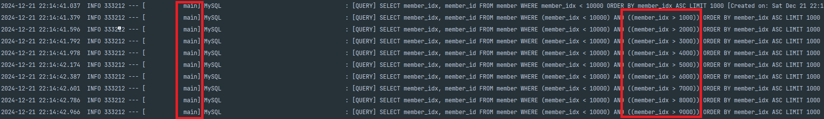 단일 쓰레드이기 때문에 Main 쓰레드가 동작하는 것을 확인 해 볼 수가 있습니다. 또한 chunk를 1000으로 설정 했기 때문에 그에 맞게 조회를 진행 하는 것을 볼 수 가 있습니다. 이번에는 단일 쓰레드가 1만건을 처리하는 걸리는 시간을 한 번 확인 해 보겠습니다.