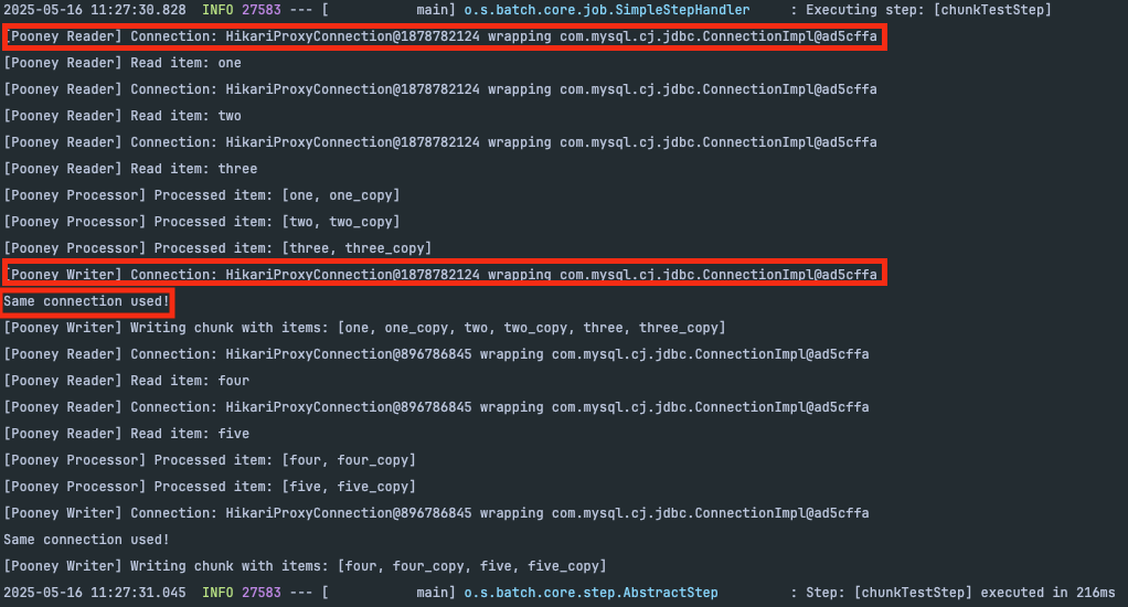보시면 reader ,writer 에서 Same connection used! 로그로 동일한 connection을 사용하는 것을 확인 할 수 있습니다. 결국 동일 connection을 사용하기 때문에 하나의 트랜잭션으로 reader에서 부터 writer까지 하나의 묶음으로 진행이 되는 것을 확인 할 수 있습니다.