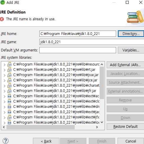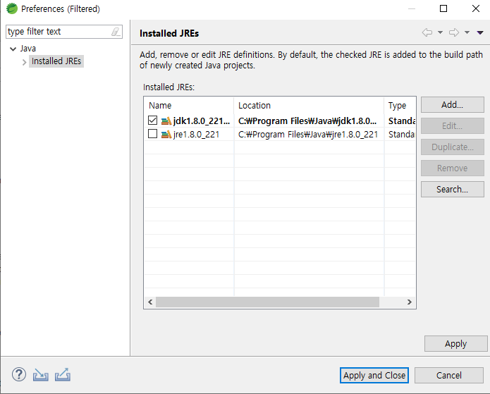 2-5 Directory.. 를 클릭 하여 JDK를 추가한다 후 Apply and Close 후 사용하면 정상 작동한다