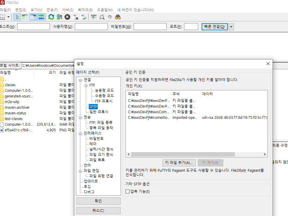 4. 파일질라를 사용하여 배포를 할 것이기 때문에 파일질라를 실행하고 설정 -> SFTP 이동 후 .ppk파일 을 추가한다