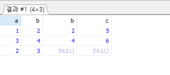 outter join은 left join 과 right join 두가지 방법이 존재한다 left , right는 어느 테이블을 기준으로 조인을 할 것 인지를 정하는 것으로 left의 경우 왼쪽기준 right의 경우 오른쪽 기준으로 join을 수행한다 이때 inner join과 달리 같은 컬럼 같을 가져야지만 조인되는 것이 아닌 같은 컬럼 값을 가지지 않는 경우에도 출력이 가능한 방법이다.