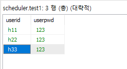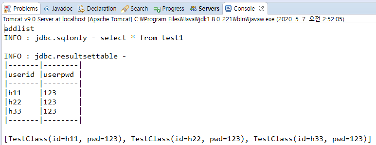 TestClass클래스의 멤버변수와 test1 테이블의 필드명이 같지 않지만 resultMap태그를 이용하여 정상적으로 값이 입력된것을 확인 할 수 있따.
