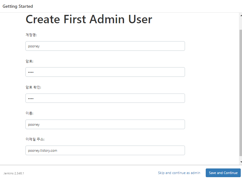 아래와 같이 Jekins Admin 계정을 만들어주세요