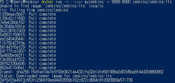 그러면 아래와 같이 젠킨스 최신버전 image를 PULL 받고 백그라운드로 실행 시킬 것입니다.