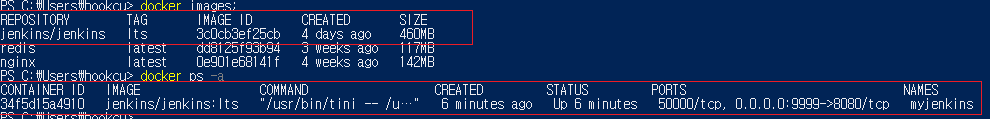 아래의 명령어를 입력하면 PULL 받은 Image 목록과 Container 목록을 확인 하 실 수 있습니다.