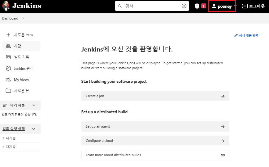 아래와 같이 우측 상단에 자신이 만든 Admin 계정명이 있으면 정상적으로 Jenkins를 성공적으로 실행 한 것입니다.