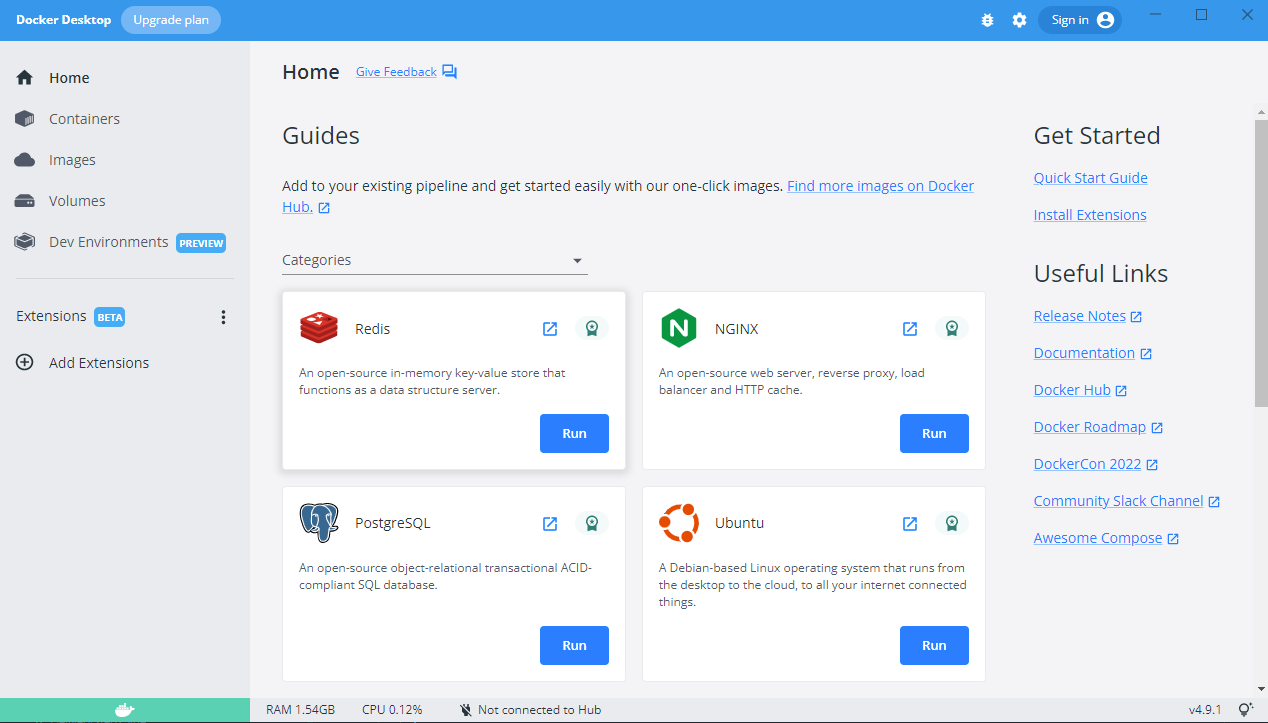 Docker desktop 을 실행하면 아래와 같은 화면이 보이고, Redis, NGINX, Ununtu와 같은 이미지들이 보입니다.